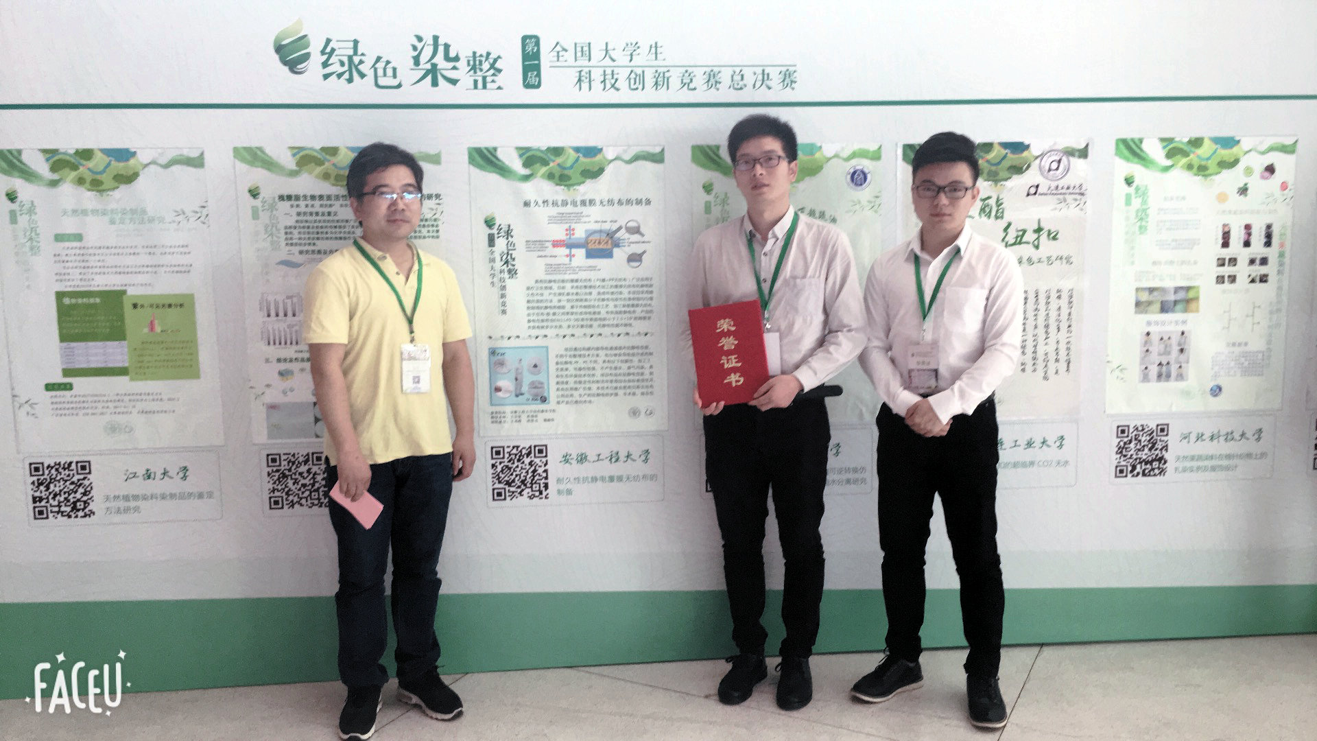 为了贯彻落实党的十九大“加快生态文明体制改革,建设美丽中国”的精神,促进纺织化学与染整工程学科建设和发展,更好地提升高校纺织化学与染整工程专业教学质量,激发大学生科技创新活力,中国纺织服装教育学会、教育部高等学校轻工类专业教学指导委员会联合组织了此项赛事,首届比赛由东华大学承办,四川大学、东华大学、新疆大学、苏州大学等29所高校150余支队伍参加了比赛,专家评委在充分考虑作品的创新性、环保性和应用性的基础上,遴选了24所高校的32项作品进入到决赛。我校纺织研17级王邓峰、杨海伟,轻化工程14级沈皆亮团队的《耐久性抗静电无纺布的制备》项目进入最终的决赛。经过现场答辩、专家质询,最终取得二等奖的优异成绩。