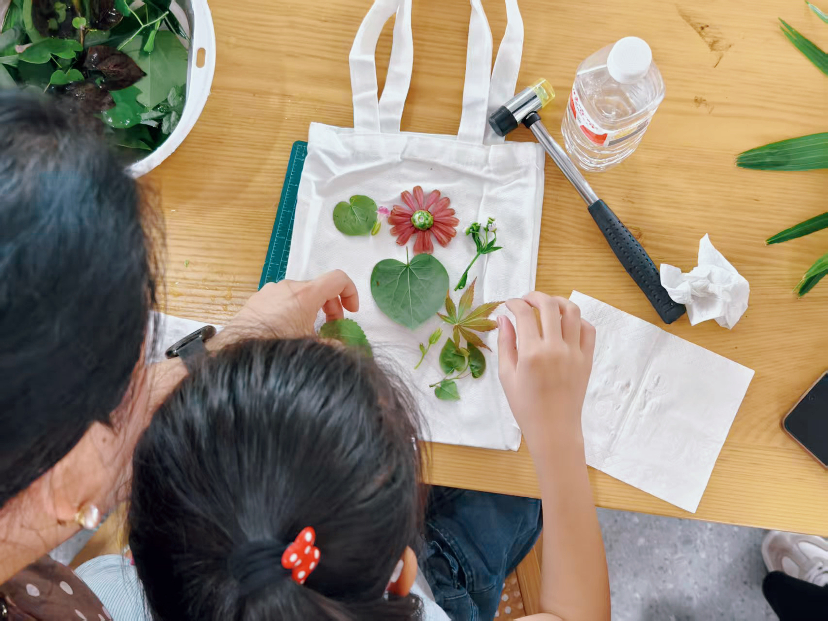 活动中,服装专业教师党支部邬红芳老师首先为现场的党员、志愿者和孩子们生动演示了捶草印花技艺。从植物选材、布局固定到敲击拓印,邬老师细致讲解每一个步骤要点,并着重强调操作安全规范,确保体验活动顺利开展。