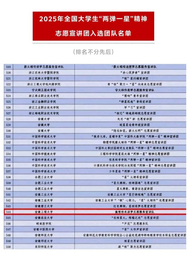 619日,由团中央青年志愿者行动指导中心与中国核工业集团有限公司联合开展的2025年全国大学生“两弹一星”精神志愿宣讲活动公布了入选团队名单,1123所高校的5680支团队提交了申报材料,最终遴选出1500支团队,我校人文学院“徽程传承逐梦志愿服务宣讲队”成功入选,这也是该团队继2023年入选“中国历代绘画大系”全国大学生志愿宣讲团后再次入选国家级志愿宣讲团。