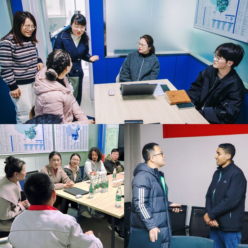 活动现场,由外国语学院MTI研究生、国际教育学院机械工程专业部分留学生和瑞泰骨干员工组成的 “跨文化交流小组成为亮点。在分组交流环节,各个小组围绕商务英语的实际应用和跨文化交际等主题开展情景模拟,企业员工在实战演练中提升语言应用能力,留学生则从语言表达和跨文化交流等方面进行了现场指导。在交流环节,韩利敏和涂文婷老师走动于各个小组之间,动态引导活动进程,帮助参与交流的企业员工和留学生更好地融入情景。