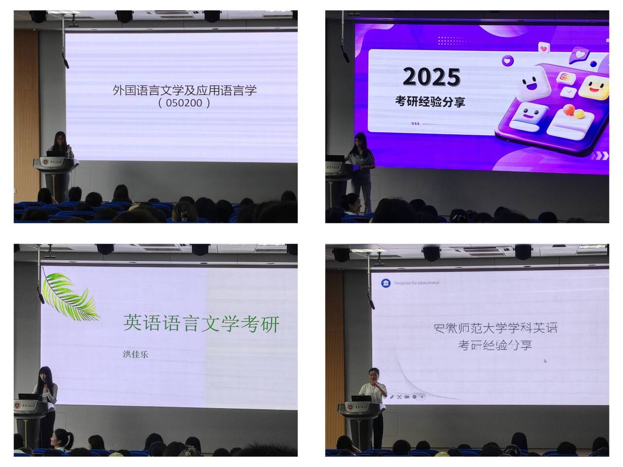 英语专业学生汪璐、洪佳乐、汪晓翔分别分享了自己考取英语学术硕士、专业硕士的经验,她们提出在各科之间要做好时间分配,提升学习效率,大量做题的同时要总结自己的问题,要做到知识点上的通懂。